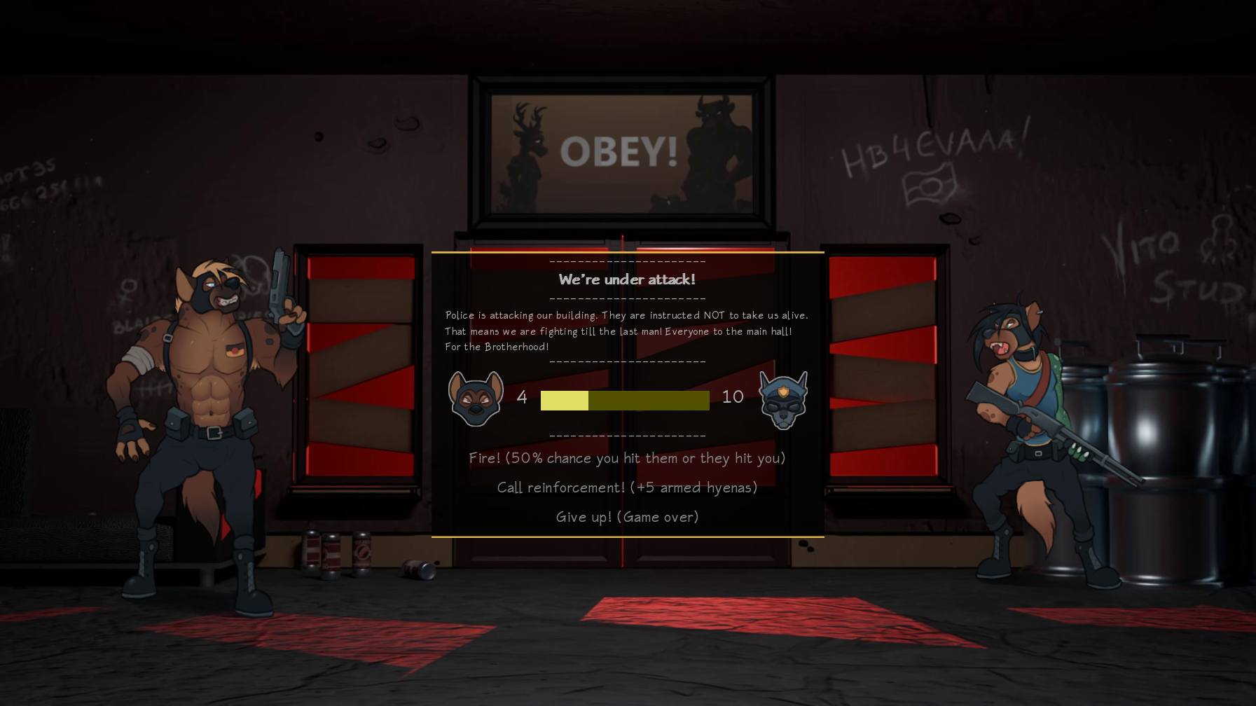 0 hope to survive the confrontation with the Hyena Brotherhood