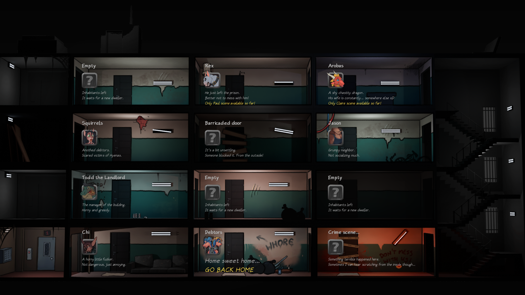 Hello! I've just discovered this game today and played it in every ways possible - great game btw! - and couldn't help but notice that some features and scenes from previous builds were missing in the current one (such as the option of having different idle if they're waiting, having the option to be naked or not, some duo sex with Vito or Francis, the milking, the cult, or a scene with the manager that is visible on the main menu, and many others...).